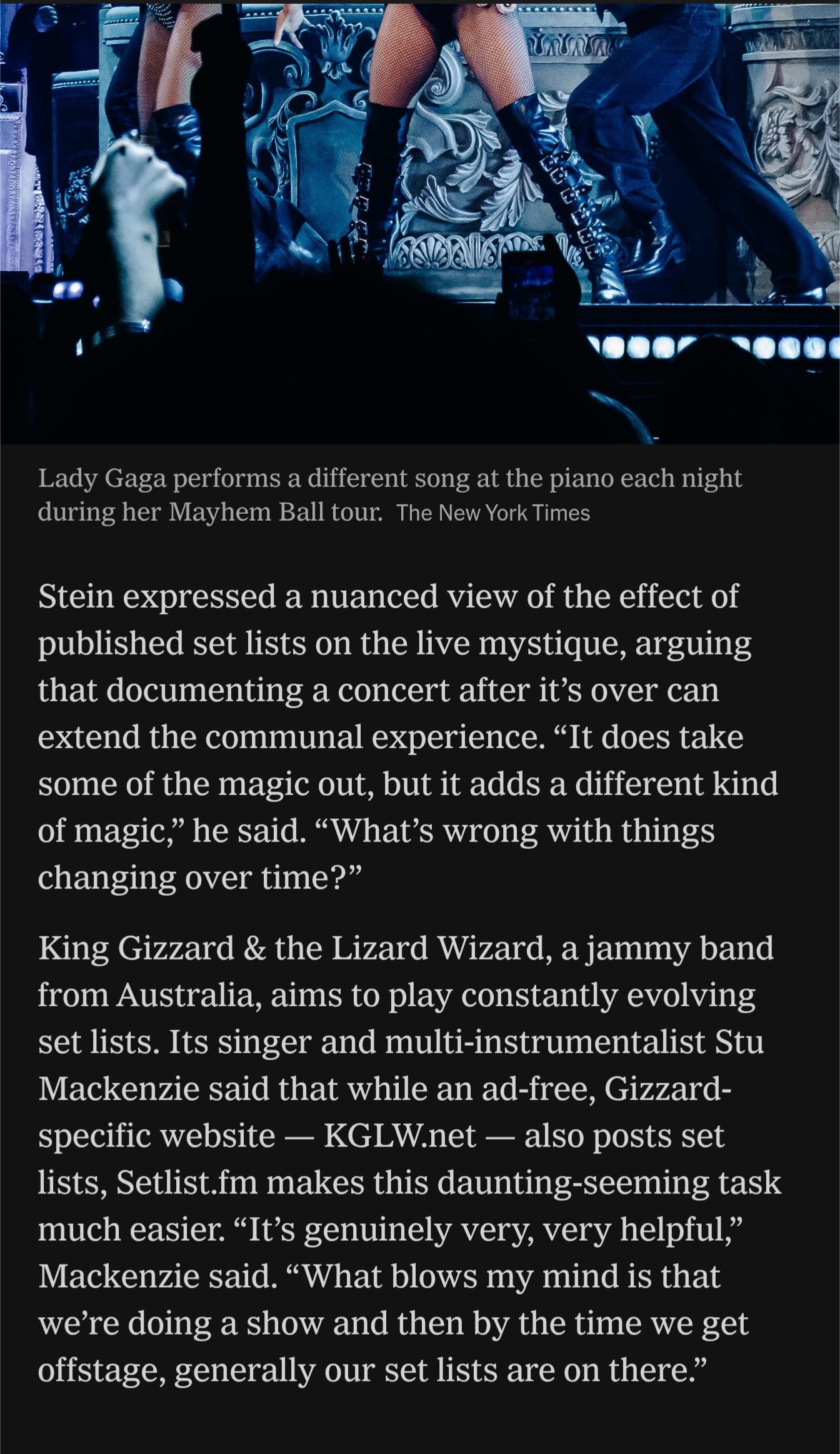 Check out this mention of KGLW.net in a NYTimes article about setlist.fm. It sounds like Stu is the one who brought us up. The comment itself isn’t particularly complimentary, but we’re pretty much the only fan site mentioned by a band member in the article. I like that we’re specifically noted as “ad-free.”